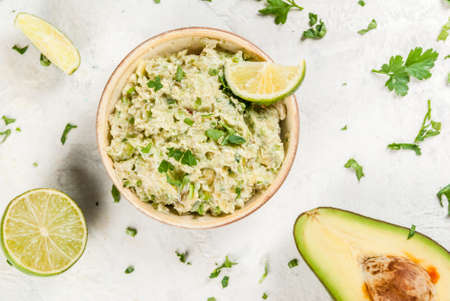 Homemade guacamole in bowl, served with lime lemon and parsley, with half of avocado on white concrete table. Top view
