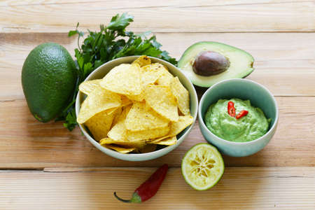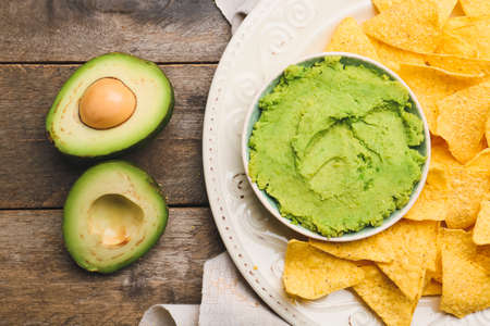 Fresh guacamole with potato chips in bowl and fresh avocados in basket on wooden table. Mexican cuisine ingredients. Top view with copy space. Concept of healthy fruit