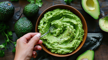 A hand reaches for a forkful of creamy avocado mash in a brown bowl on a rustic wooden table. Surrounding the bowl are whole avocados and sprigs of cilantro, creating a vibrant green scene. The dish is garnished with black pepper, adding a touch of spice to the creamy texture.