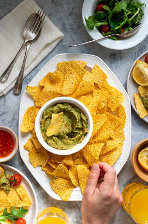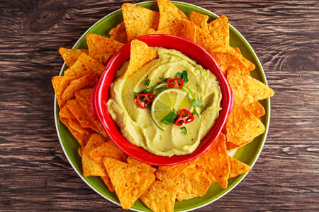 Party food, nachos chips and homemade guacamole, tortilla chips snack. Party food.