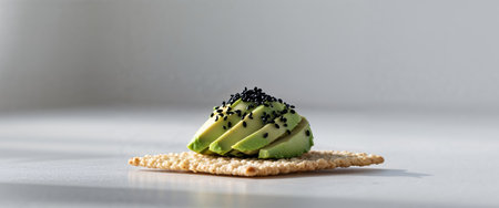 AI Generated. Crispy rice cracker topped with creamy avocado and black sesame seeds