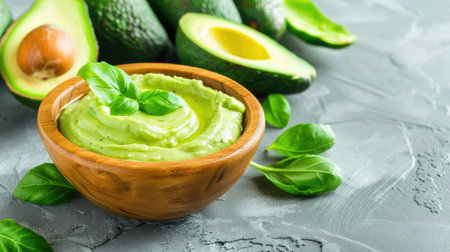 This image features a delicious avocado dip made with fresh basil, displayed in a wooden bowl. Surrounding the bowl are ripe avocados, creating an inviting and wholesome atmosphere perfect for healthy recipes.