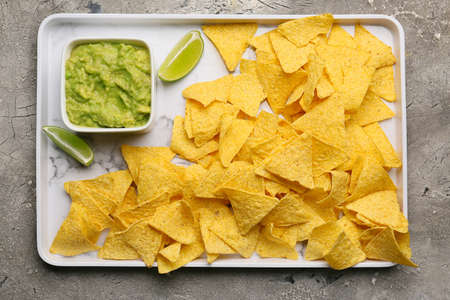 Bowl with tasty guacamole, lime and nachos on grunge background