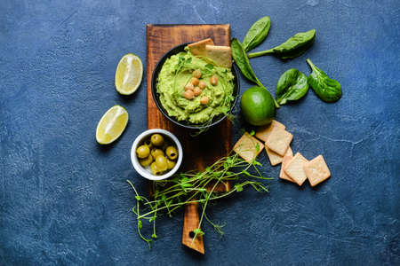 Classic Homemade avocado hummus with olive oil, pita chips, lime, chilli, parsley on wooden background.