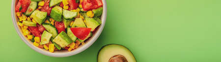Tasty avocado salad with tomatoes, cucumbers in bowl on green background with copy space banner.