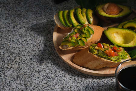 Closed up with avocado toasts, avocado, avocado slices and coffee, healthy snack, healthy food.