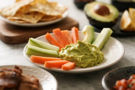 Traditional Mexican cold appetizer made of pureed avocado pulp with bread and vegetables on the table. Concept healthy vegetarian Breakfast