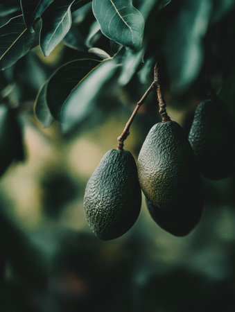 Close-up view of ripe avocados with deep green skin, suspended from a tree branch surrounded by an orchards soft, blurred backdrop.