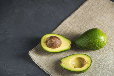 Avocado fruit cut in half on the linen fabric background. The concept organic eco products for food and cosmetic procedures