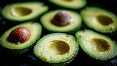This image features several avocado halves, showcasing their green flesh and brown seeds. The composition offers a close-up view, highlighting textures and details. The lighting appears soft, creating a natural feel, while the dark background enhances the colors. It could be used for culinary content or healthy eating concepts.