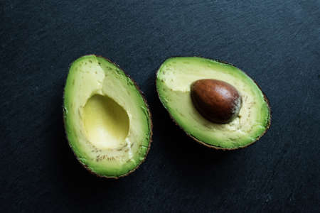 Halved fresh avocado on slate background