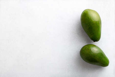 Two avocados on a white background, top view, copy space
