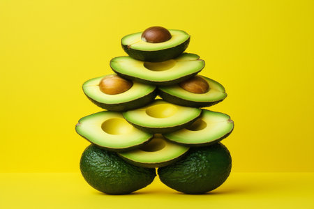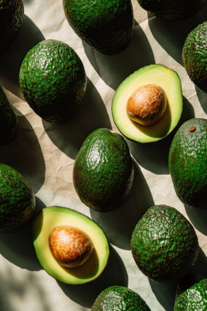 AI Generated. Freshly sliced avocados displayed in various orientations showcasing their rich green flesh and brown pits