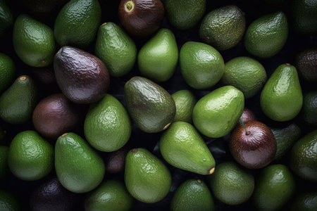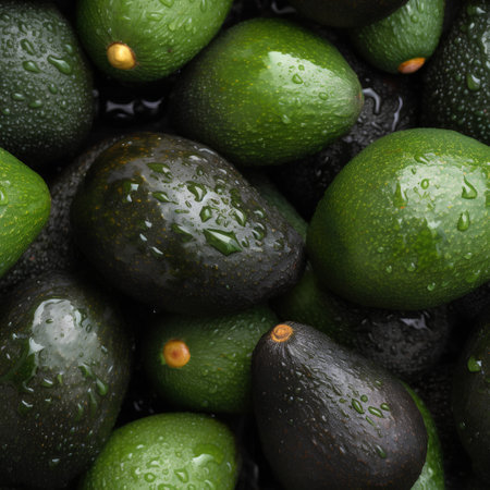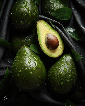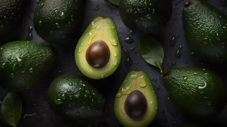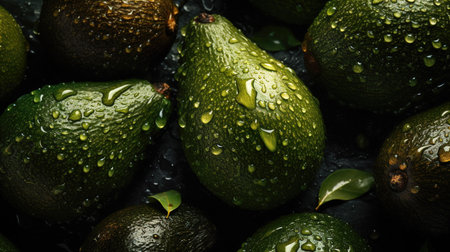 An AI generated illustration of ripe avocados with vibrant green and earthy brown hues, featuring glistening water droplets across their surfaces