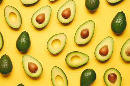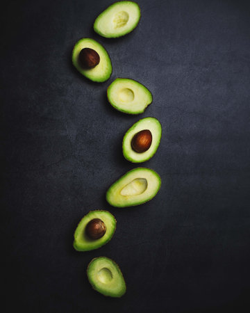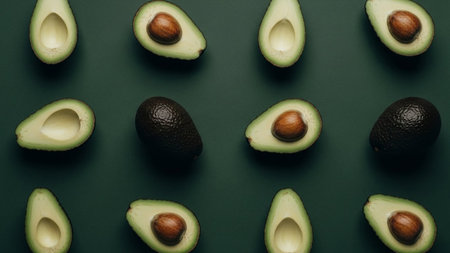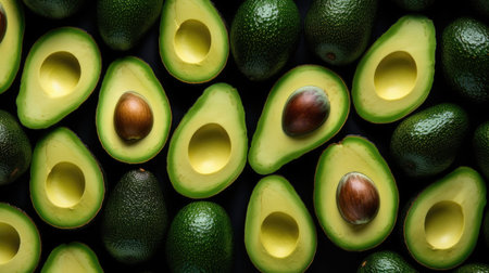 A visually appealing pattern of sliced avocados arranged on a dark green background. Each avocado half is presented with its vibrant green flesh and rich brown pit, creating a striking contrast. The consistent arrangement and repetition of the slices form a clean and symmetrical pattern. highlights the fresh, natural beauty of avocados and is themes related to healthy eating, organic produce, or culinary inspiration.