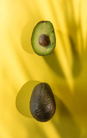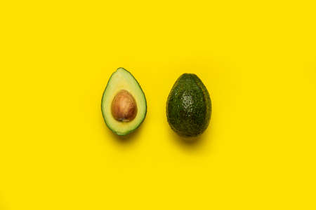 Whole and half an avocado on a bright yellow background. Top view, flat lay.
