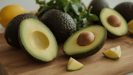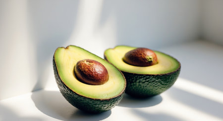 AI Generated. Fresh Avocados Halved with Creamy Flesh and Seed Displayed