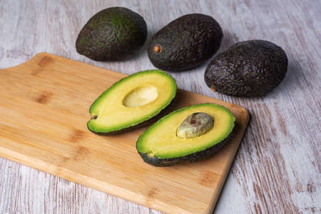 Wood to cut with an avocado cut into two pieces next to other avocados.
