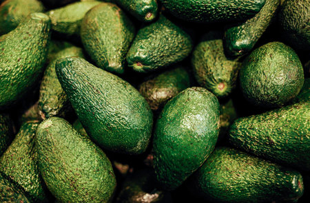 Fresh ripe avocados background. Top view. Close up.