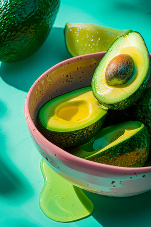 Fresh Avocado Halves and Slices in a Pink Bowl on a Turquoise Background with Vibrant Lighting Healthy Food Concept AI Generative