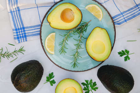 Slices of fresh avocado with herbs and lemons lies on the table on a blue plate. flat lay. top view. Healthy food concept. Diet. Vegan.