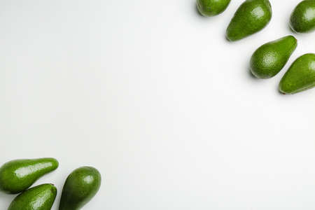 Flat lay composition with ripe avocados on white background, space for text. Top view