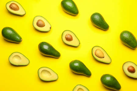 Halves of fresh avocados on color background