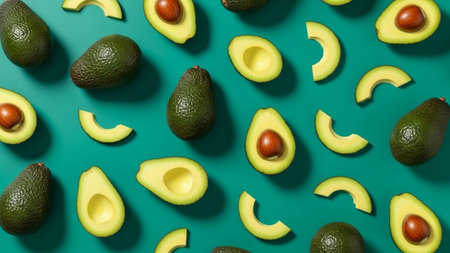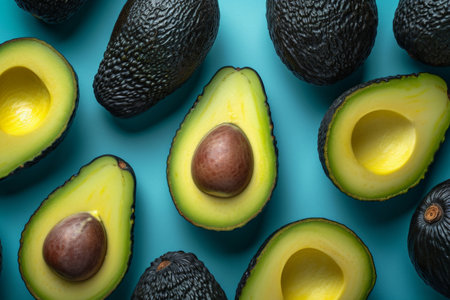 A vibrant and visually appealing arrangement of avocados is presented on a striking teal background. The composition whole, dark green avocados alongside perfectly halved fruits revealing their creamy green flesh and central brown pit. Slices of avocado are scattered throughout, showcasing their unique shape and texture. This dynamic flat lay creates a lively pattern, highlighting the freshness and natural beauty of the fruit, making it food-related and concepts.