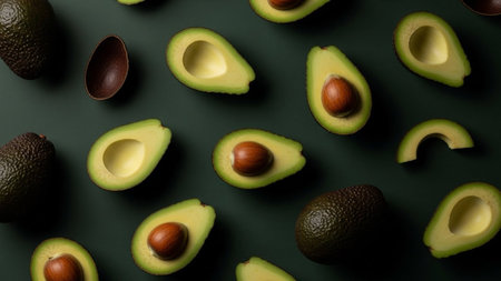 An overhead view of a collection of avocados arranged on a dark green background. The showcases both whole avocados and those expertly sliced in half, revealing their creamy green flesh and prominent brown pits. The arrangement creates a visually appealing pattern, highlighting the natural beauty and texture of the fruit. is illustrating healthy eating, organic produce, and culinary themes.