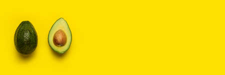 Whole and half an avocado on a bright yellow background. Top view, flat lay. Banner.