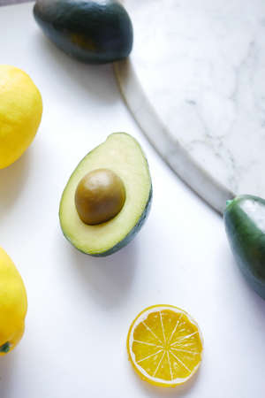 slice of avocado and lemon on white table