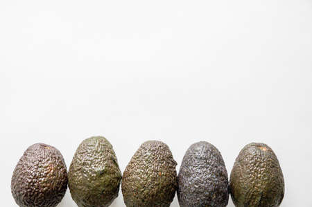 A high angle shot of five Avocados on a white surface