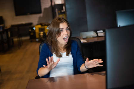 Young annoyed angry woman holding hands in furious gesture on blue background