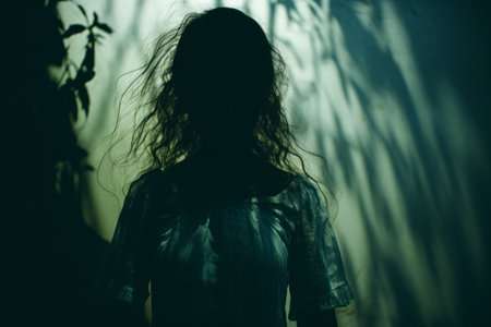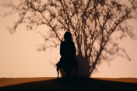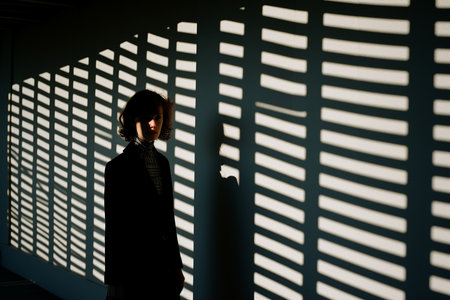 A woman stands still beside a wall, her profile illuminated by the warm, soft light of late afternoon. Shadows dance gently around her, creating a calm atmosphere.