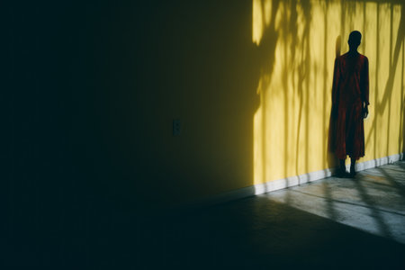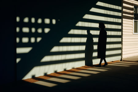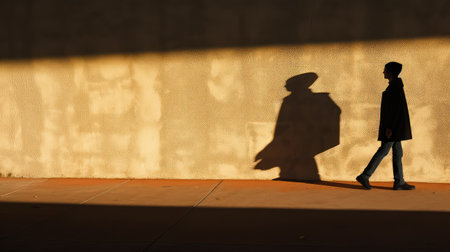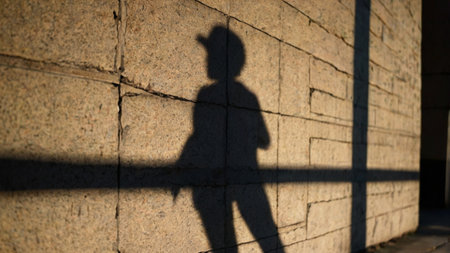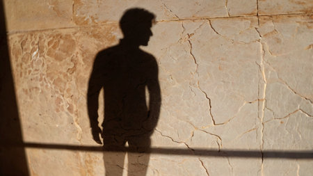 Shadow of a man standing in front of a wall with sunlight and shadows