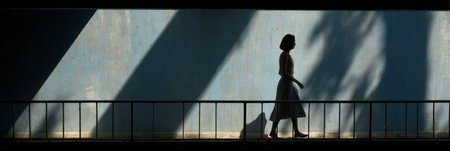A young woman wearing a dress walks along a metal railing. Strong sunlight casts harsh geometric shadows and leaf shadows across a painted blue concrete wall.