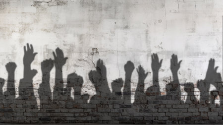 Shadow of the Hands, Arms and Fists of Protestors Against a Grungy Blank Brick Wall Ready for Your Text.