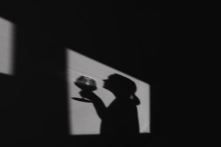 Shadow on the wall of a female sommelier with a glass of wine. Chiaroscuro from the window. Copy space.
