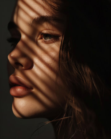 Shadow Plays on a woman's face, creating abstract patterns in a room lit by diffused daylight. Fashion magazine portrait