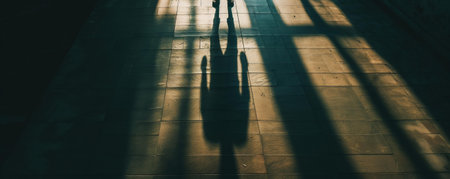 Human shadow on a dark floor against a dark background.