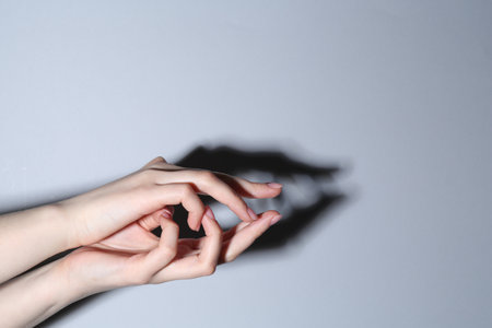 Shadow puppet. Woman making hand gesture like crocodile on gray background, closeup. Space for text