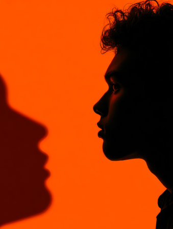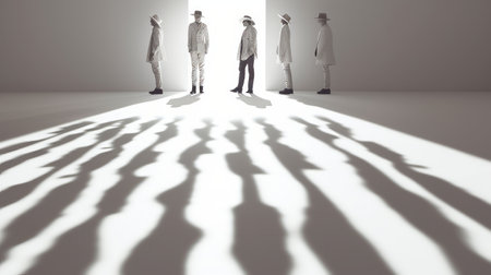 A person confidently stands apart from a line of identical shadows, emphasizing the theme of individuality and self-assurance.