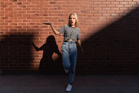 Excited blonde girl in grey t-shirt and blue jeans shows, holds your prodact on the open palm isolated over red brick wall