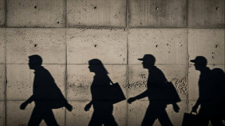 Minimalist human silhouettes walking against a glowing monochrome backdrop