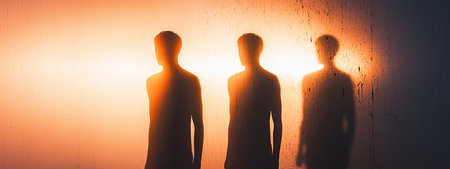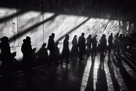 Four silhouettes stand quietly against a brightly lit concrete wall, creating a strong contrast. The scene has a dramatic and artistic feel, focusing on the play of light and shadow.