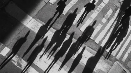 High-angle shot of people's shadows on a zebra crossing, forming abstract shapes on the urban street.