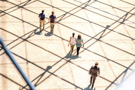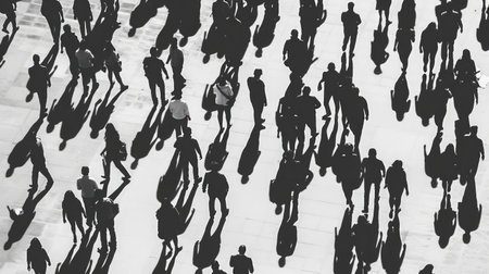 Silhouettes of people walking on city street and casting shadows on pavement, general public concept for any community related theme.