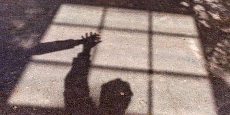 The shadow of the silhouette of a man and a hand against the background of the shadow of a window and a lattice