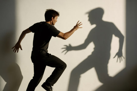 Male dancer leaping towards his own shadow projected on a white wall, creating a dramatic and artistic composition