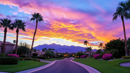 Captivating sunset view over a residential neighborhood featuring palm trees and blooming flowers. A peaceful, vibrant scene adorned with colorful clouds.